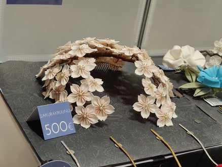 Taidekujalta rakastuin tähän hiuskoristeeseen ja sanoinkin sen tekijälle et jos ja kun se päivä koittaa et ite oisin naimisiin menos ni tiiän keneltä ostan/tilaan hiushärpäkkeet. vastaavanlaiset korvakorut yhellä sakura kukalla oli 35e ja sellasen ostin itselleni.